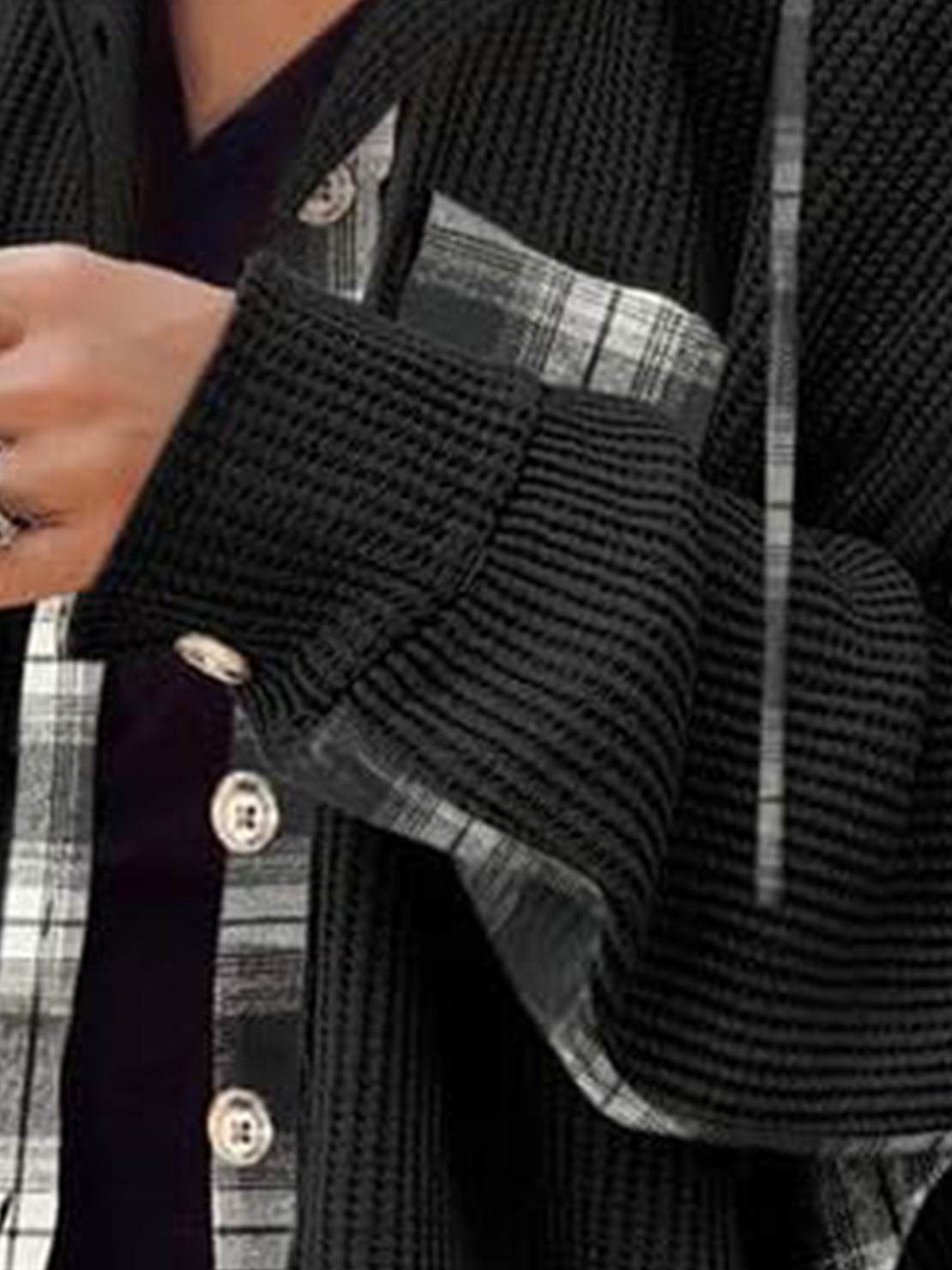 The hooded shacket falls to hip length with a relaxed drape through the shoulders. The waffle knit texture provides warmth without bulk. Intended for daily wear and layering over basics.