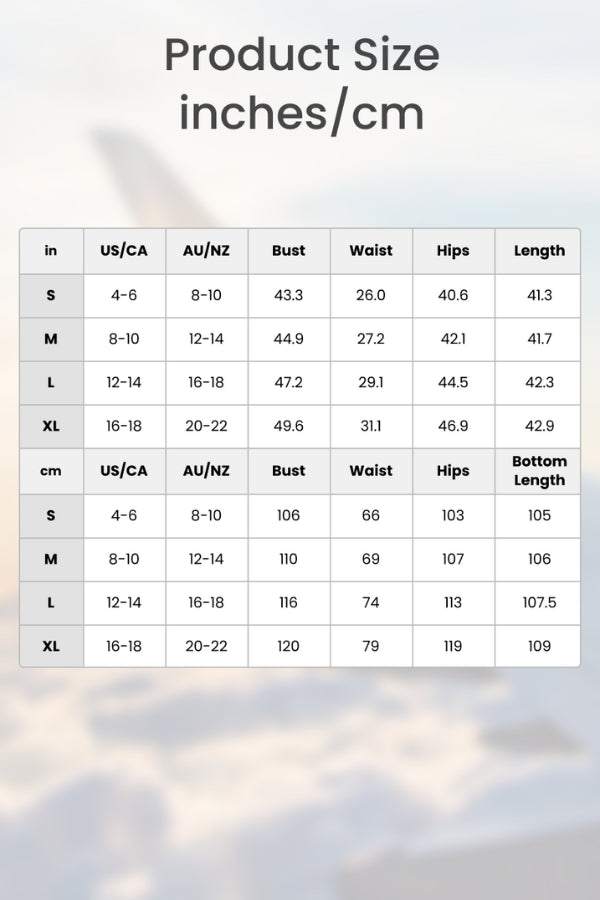 | Size | US/CA | AU/NZ | Bust | Waist | Hips | Length |