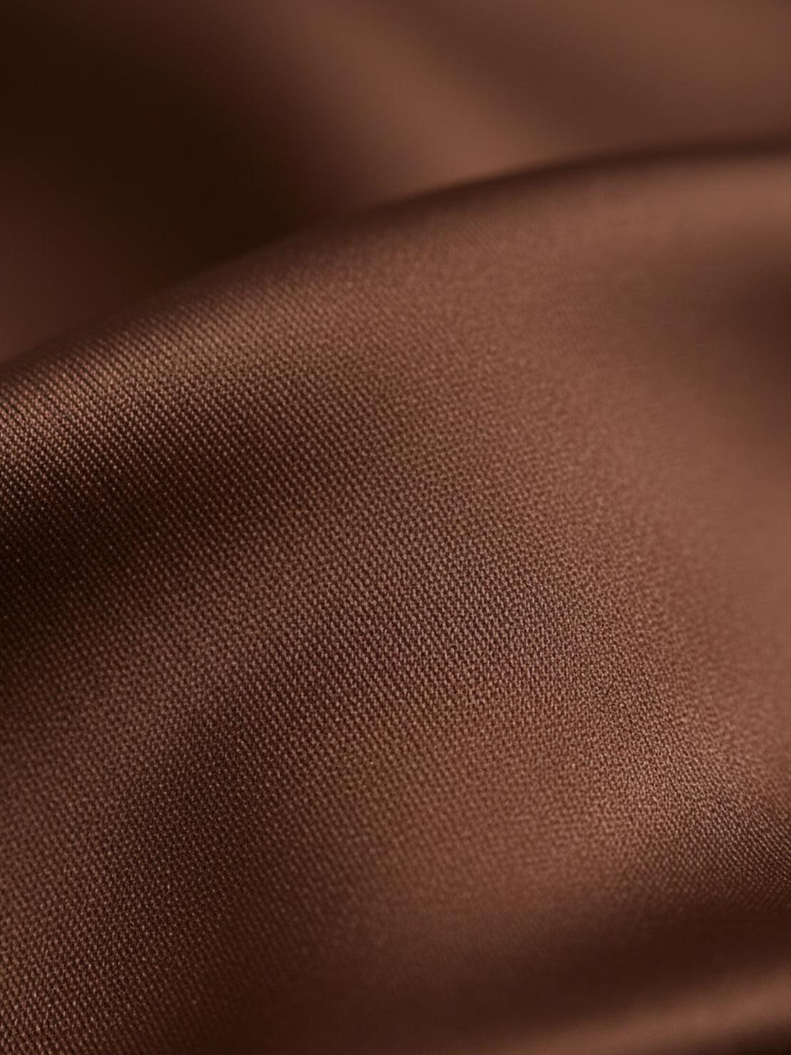 The fabric has a smooth finish and subtle sheen that mimics silk's appearance and drape. While it's polyester, the quality of the weave gives it a refined look that reads as more expensive than it is.